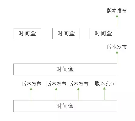 固定时间盒,只是定义了一个固定的周期,然后定义这段时间里需要做的事情,有可能几个时间盒之后才会有发布,也有可能一个时间盒结束后有一次发布,甚至有可能时间盒中间就会有发布。可以简单用下面三个图来标志:
