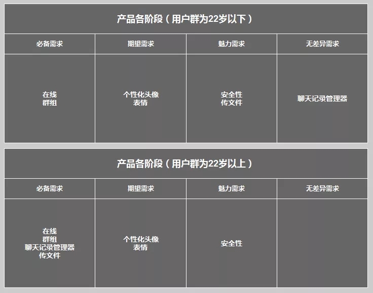 表情:表情主要是提升用户聊天的体验,如果有这样功能,用户满意度会有 很大提升,但如果没有,最开始的用户可能都不会去想到原来聊天还可以用表情这样的东西,所以满意度并 不会下降。